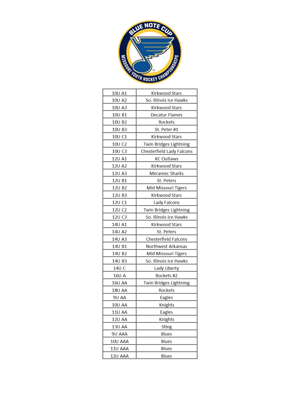 Each year the Missouri Hockey Youth Division has hosted a season ending Championship Tournament for all teams participating in the Youth Division Travel (A1 thru C) Leagues. AAA and Central States teams in non-National bound age groups also have division Championships as part of the tournament. For many years the tournament was known as the State Championship Tournament or the SCT. In 2017 Missouri Hockey Youth Division and the St Louis Blues teamed up to take the tournament to another level. The event is now called the Blue Note Cup – Missouri Youth Hockey Championships.